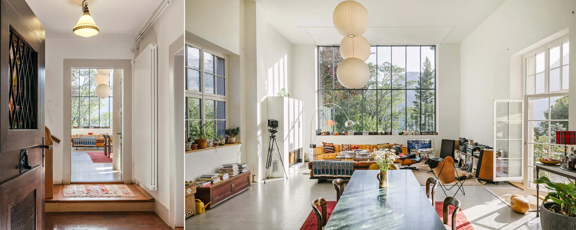 Der loftartige, lichtdurchflutete Atelierraum mit Bodenheizung ist das Herzstück von »Adlernest«. In der Grosszügigkeit der grandiosen, rund fünf Meter hohen Wohnhalle entspannt man sich mit Blick auf die Natur – oder man feiert gemeinsam mit Familie und Freunden am Cheminée.