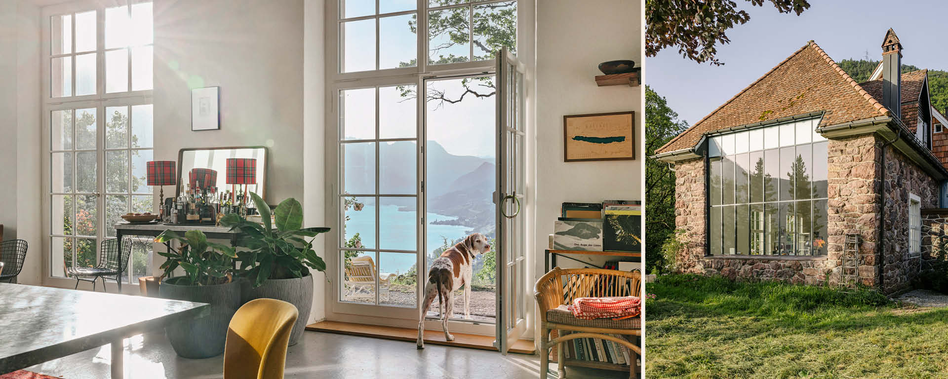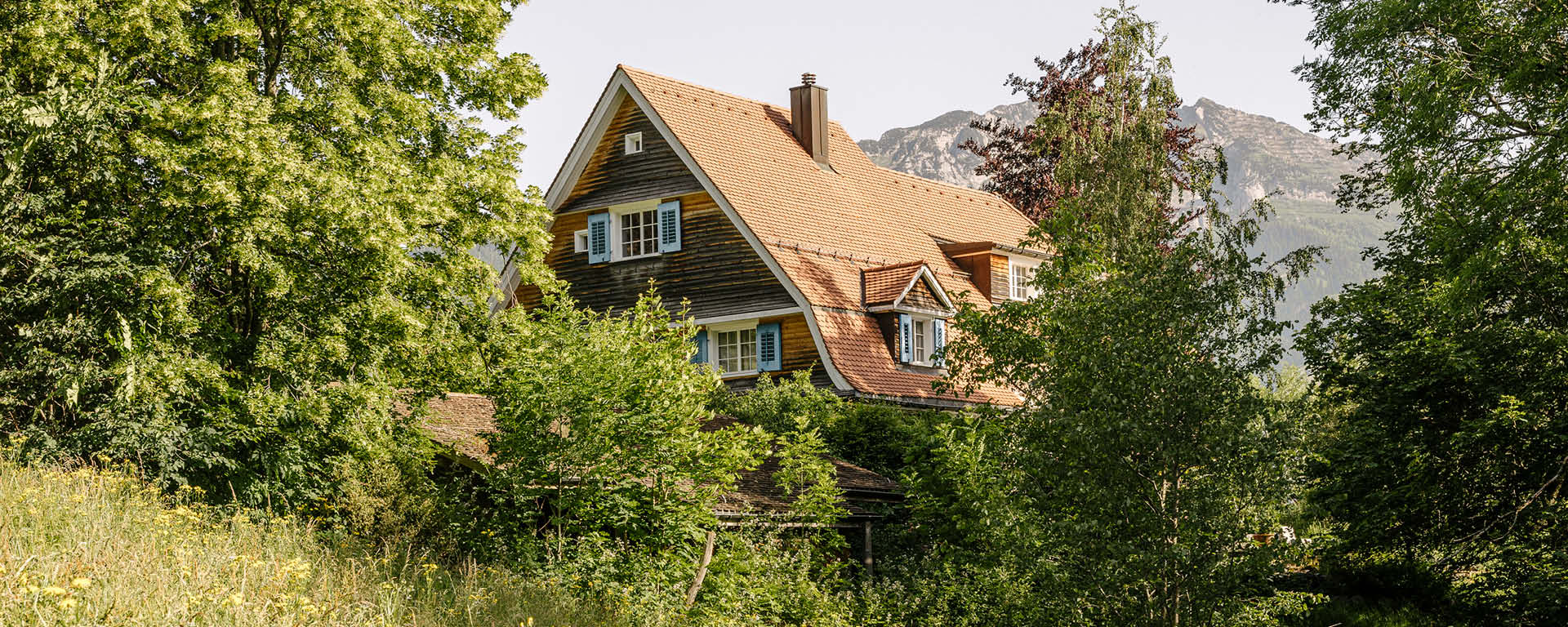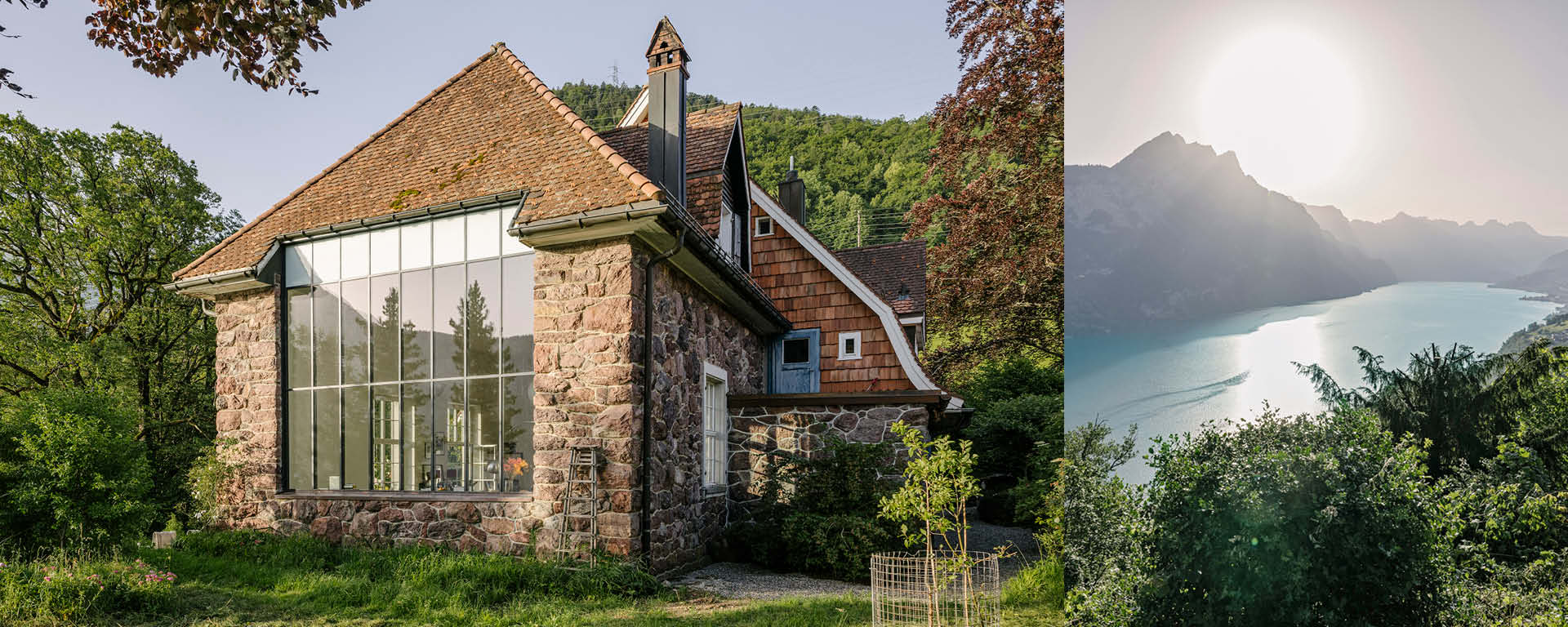 »Adlernest« liegt inmitten eines weitläufigen Umschwungs mit Wald und Wiesen, mit Garten, Teich und einem Aussichtspavillon. Der Blick schweift über die gesamte Länge des Walensees bis zu den Gipfeln der Alviergruppe weit im Osten – eine gewaltige Naturarena, in der das wechselnde Sonnenlicht und die Wolken die Hauptrolle spielen.