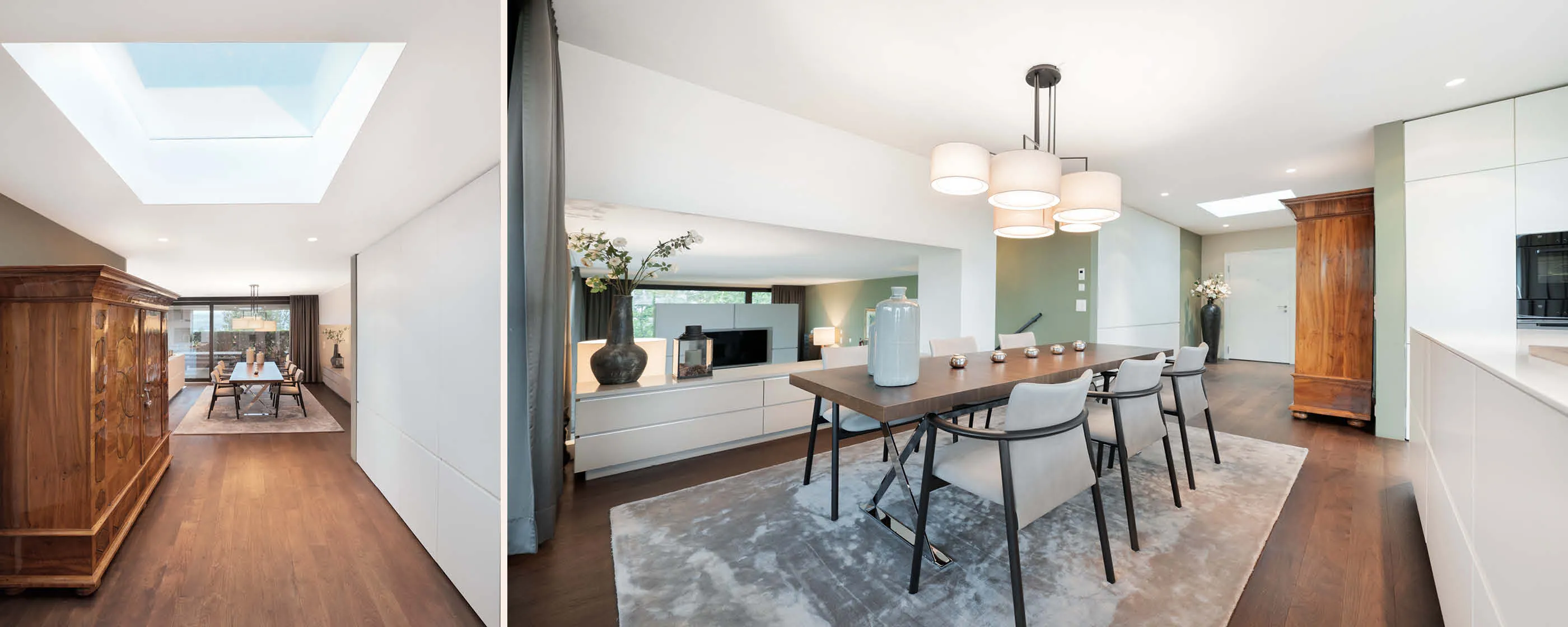 Das über ein grosses Dachfenster belichtete Entrée empfängt mit massgefertigter Garderobe, Reduit und einem Gästebad mit Dusche. Geradeaus gelangt man direkt ins kommunikative Zentrum der Wohnung, den geräumigen Essbereich, in dem man sich gerne mit Familie und Freunden bei einem köstlichen Festmahl versammelt. Im Osten schliesst der hochwertige Küchenbereich mit einer langgestreckten Arbeitsinsel an. Das gesellige Zusammensein kann sich jederzeit auf der überdachten Terrasse fortsetzen.