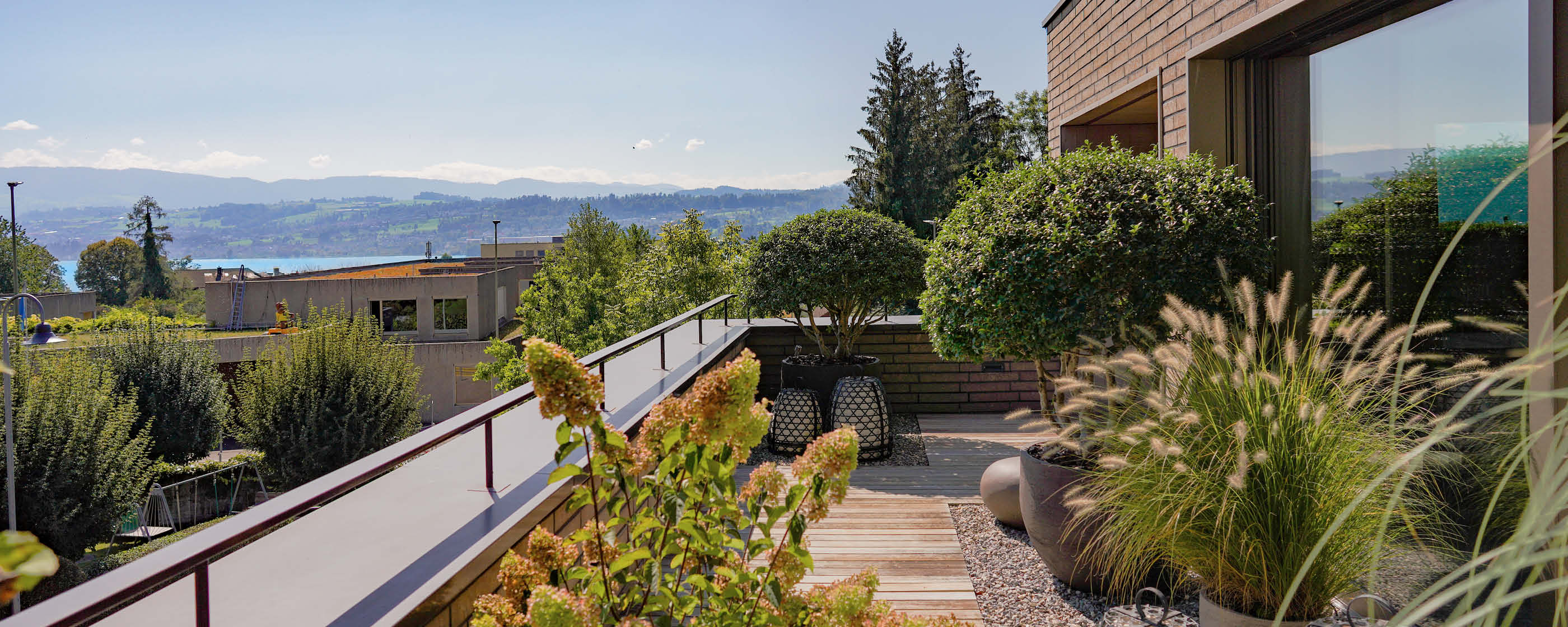 Auf den Terrassen der Attikawohnung kann man nach einem betriebsamen Tag die spektakuläre Zürichseelandschaft in Ruhe beobachten. Mit »skygarden« hat man sich einen traumhaften Logenplatz an der Goldküste gesichert – und kann doch jederzeit schnell in die betriebsame Wirtschafts- und Kulturmetropole Zürich eintauchen.
