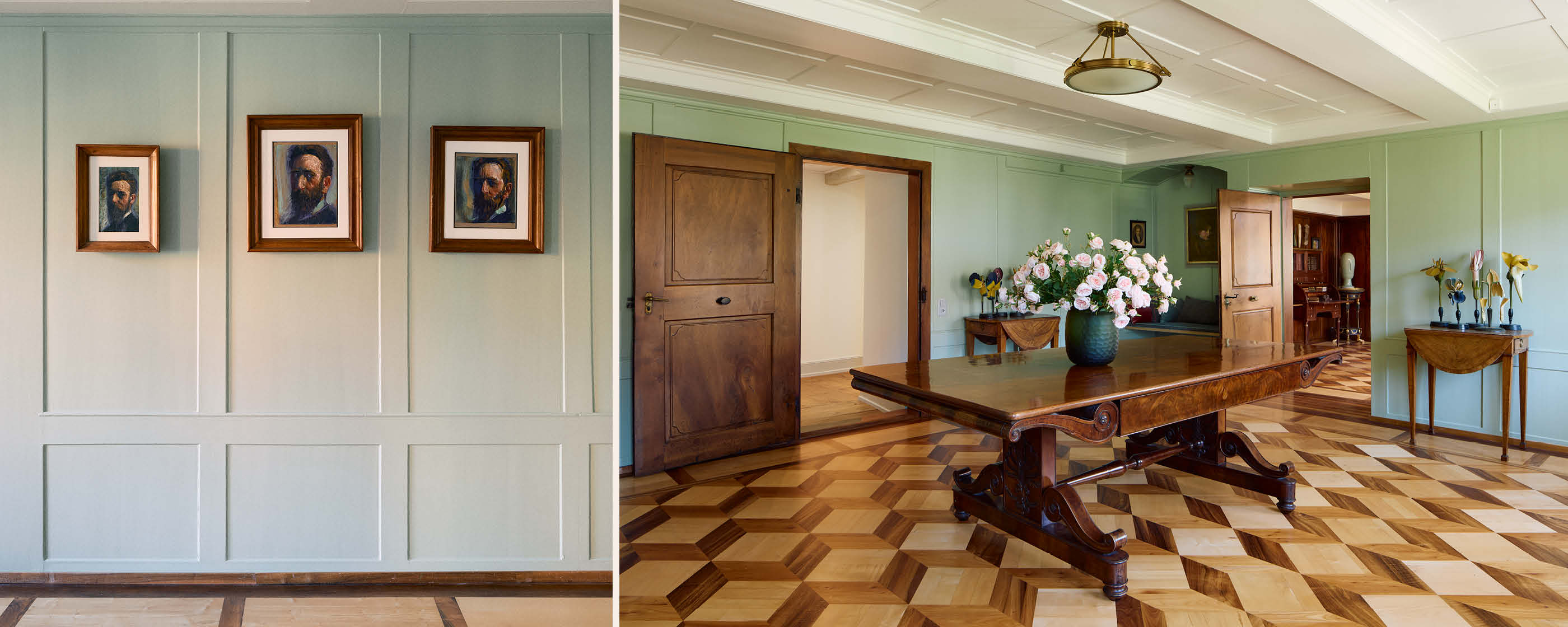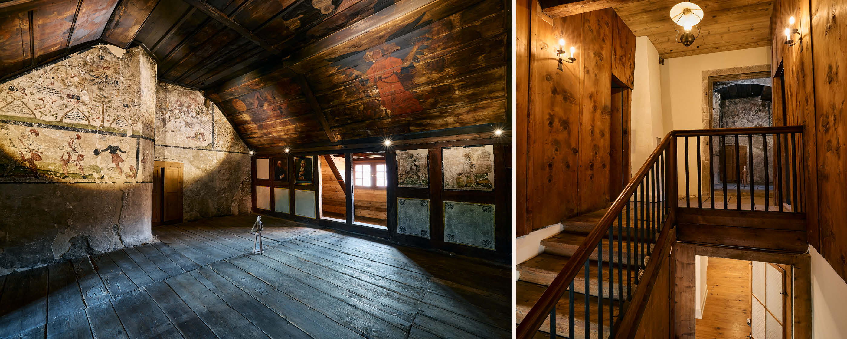 Die prachtvolle äussere Erscheinung setzt sich auch im Innern des historischen Anwesens fort. Hinter jedem Flur, hinter jeder Tür eröffnet sich eine eigene Welt mit edlen Parkettböden, hochwertigen Täferungen, festlichen Kachelöfen und anderen erlesenen Details. Im grossen Festsaal des Dachgeschosses scheint das magische Licht der Alpen die faszinierenden Wandmalereien zu neuem Leben zu erwecken.