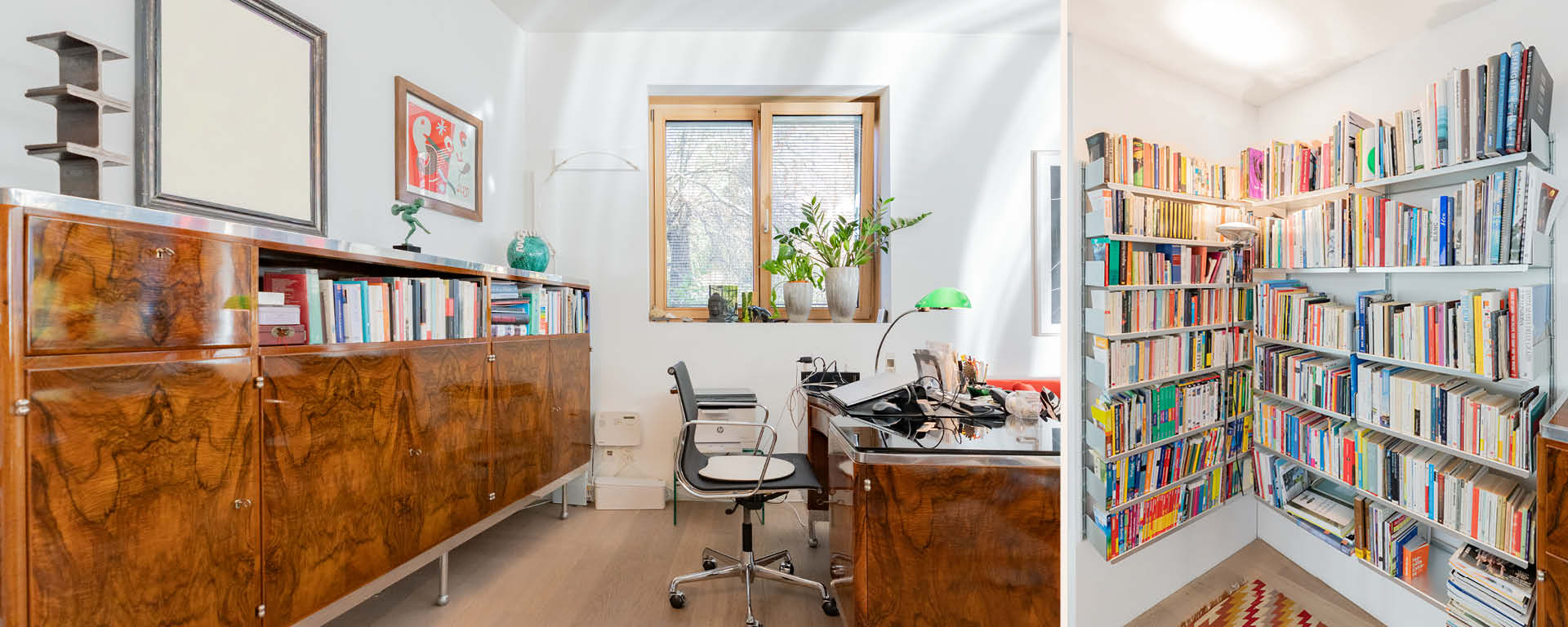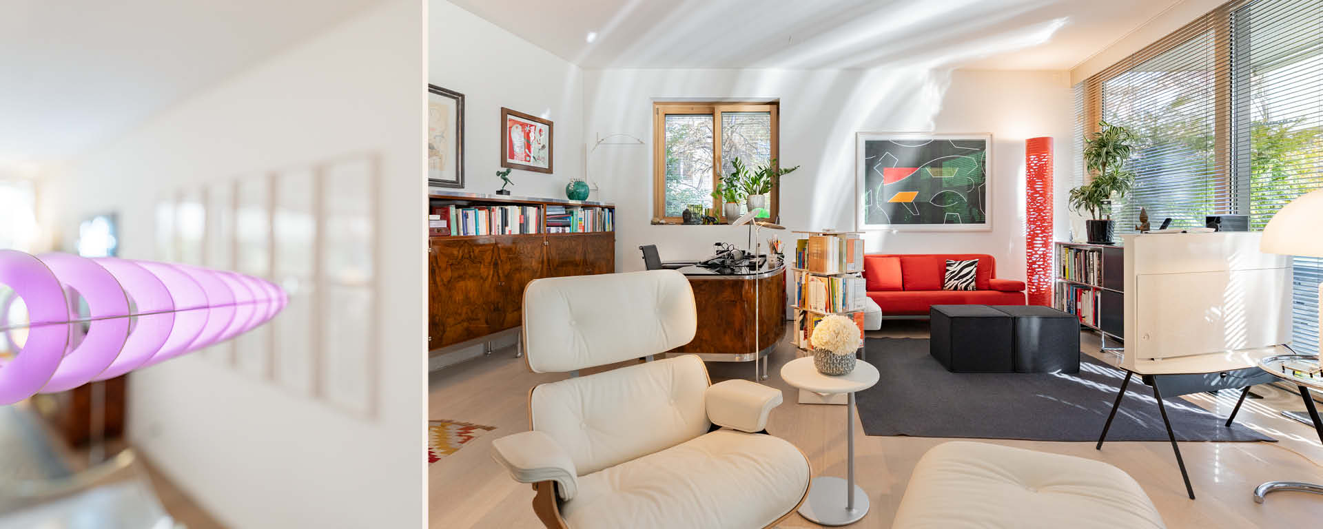 Im grosszügigen Wohnbereich kann man sich zwischen Einrichtungsklassikern der Moderne, Kunstobjekten und historischen Familienstücken wunderbar entspannen – immer mit Sicht auf den Himmel über Zürich. Im Nordosten entfaltet sich ein stimmungsvoller Teilbereich für eine Bibliothek und ein inspirierendes Office.