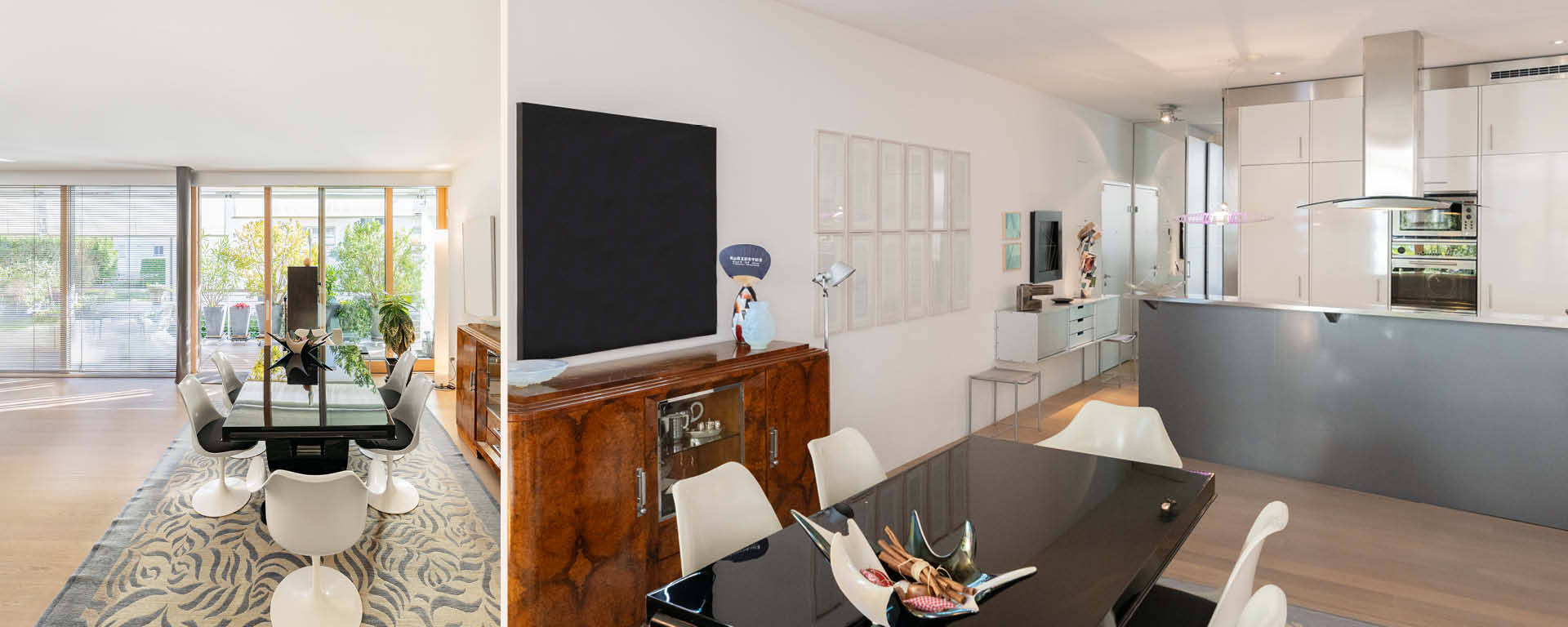 Der Arbeitsbereich der offenen Küche orientiert sich über eine langgestreckte Arbeitsinsel zur Wohnhalle; eine erhöhte Frühstücksbar verdeckt geschickt den Arbeitsbereich. Der Essbereich bietet Platz für eine grosse Tafel, an der man sich gerne zu einem köstlichen Festmahl versammelt. Das gesellige Zusammensein kann sich jederzeit auf dem grossen Balkon im Freien fortsetzen.