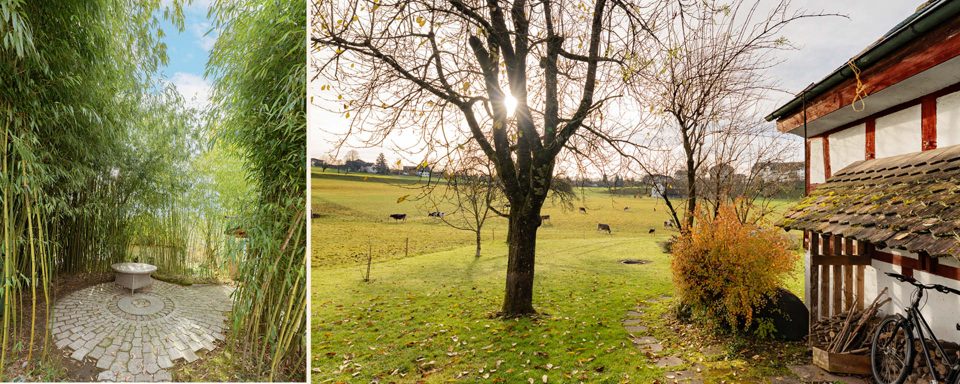 »Frohsinn« besteht aus einem Wohnhaus, einem umgebauten Rossstall und einem Riegelhaus – alle mit viel Liebe zum Detail renoviert. Das weitläufige Gartengrundstück geht im Süden allmählich in die freie Landschaft über. So eignet sich das Wohnensemble ideal als Familiensitz mit vielen Rückzugsmöglichkeiten oder für eine Nutzung durch mehrere Parteien. Trotz der ländlichen Idylle ist Zürich über die Forchstrasse in rund 20 Minuten erreichbar.