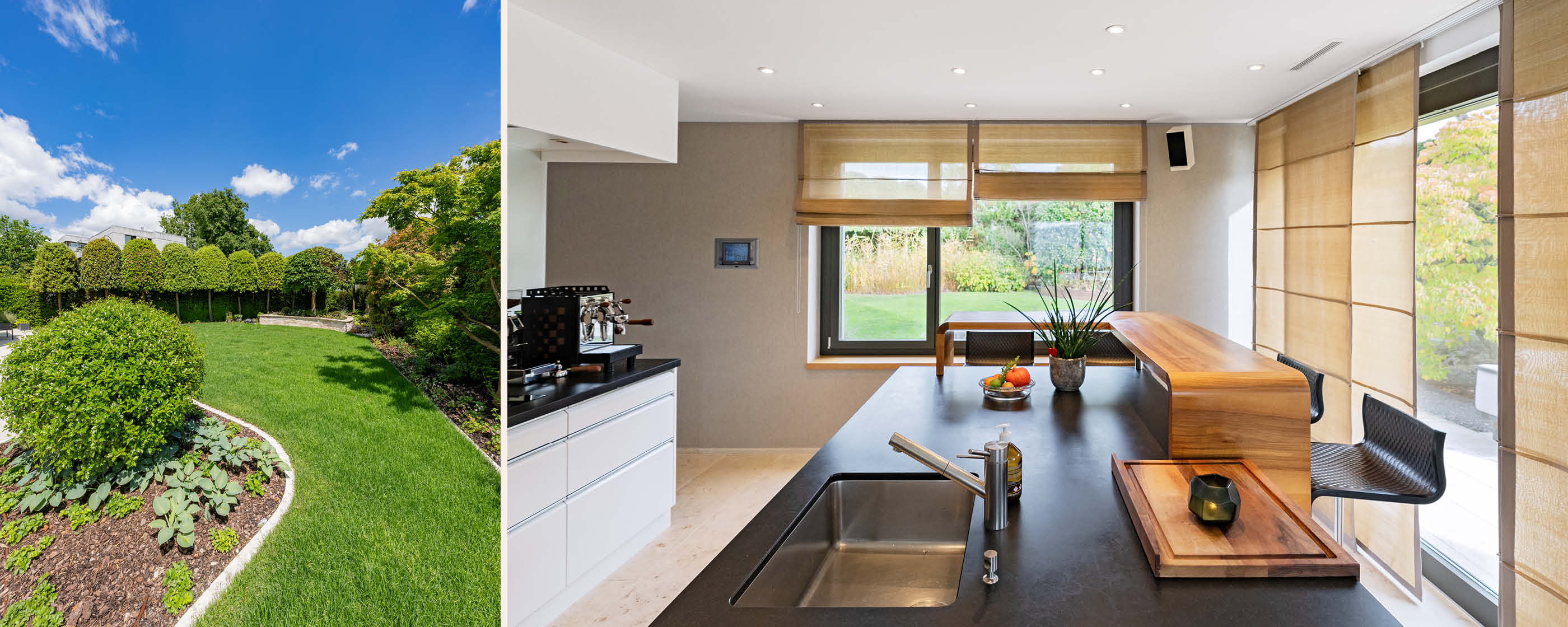 Die luxuriöse Küche verfügt über ein Backoffice und eine eigene Aussenterrasse. Ein Layer aus Holz bildet auf der zentralen Arbeitsinsel eine praktische Frühstückbar. Darüber hinaus gibt es im Erdgeschoss noch ein Bad und ein charmantes Arbeitszimmer.