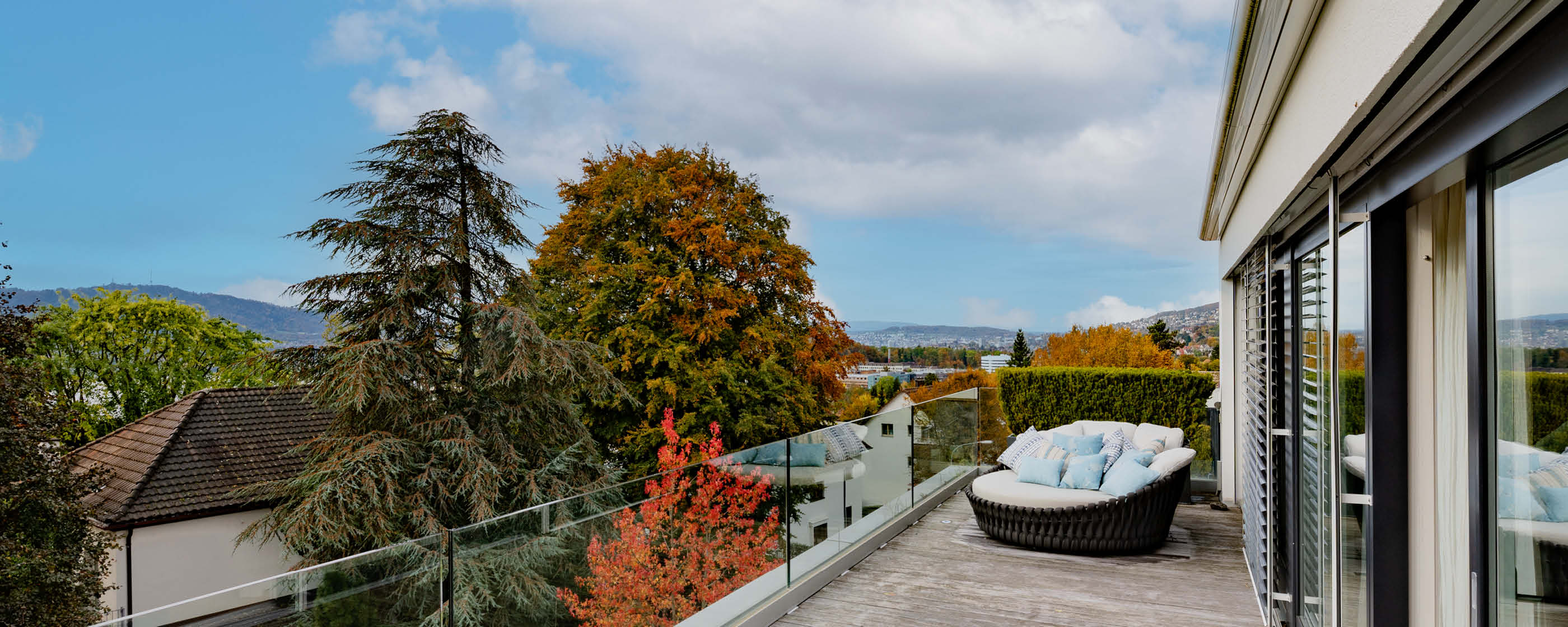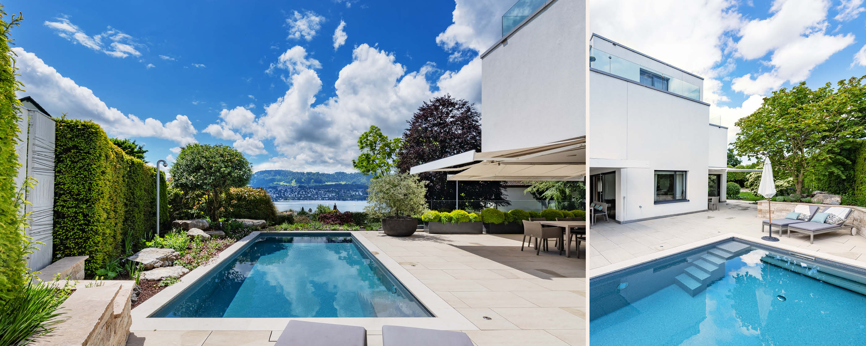 Auf der grossen Poolterrasse der Villa »GOLD« geniesst man die spektakuläre Aussicht auf die Goldküstenlandschaft, den Zürichsee und die Albiskette, während die Kinder im Wasser ihren Spass haben. In dieser Atmosphäre von Freiheit und Weite ist es kaum zu glauben, dass die betriebsame Weltstadt Zürich in unmittelbarer Nähe liegt.