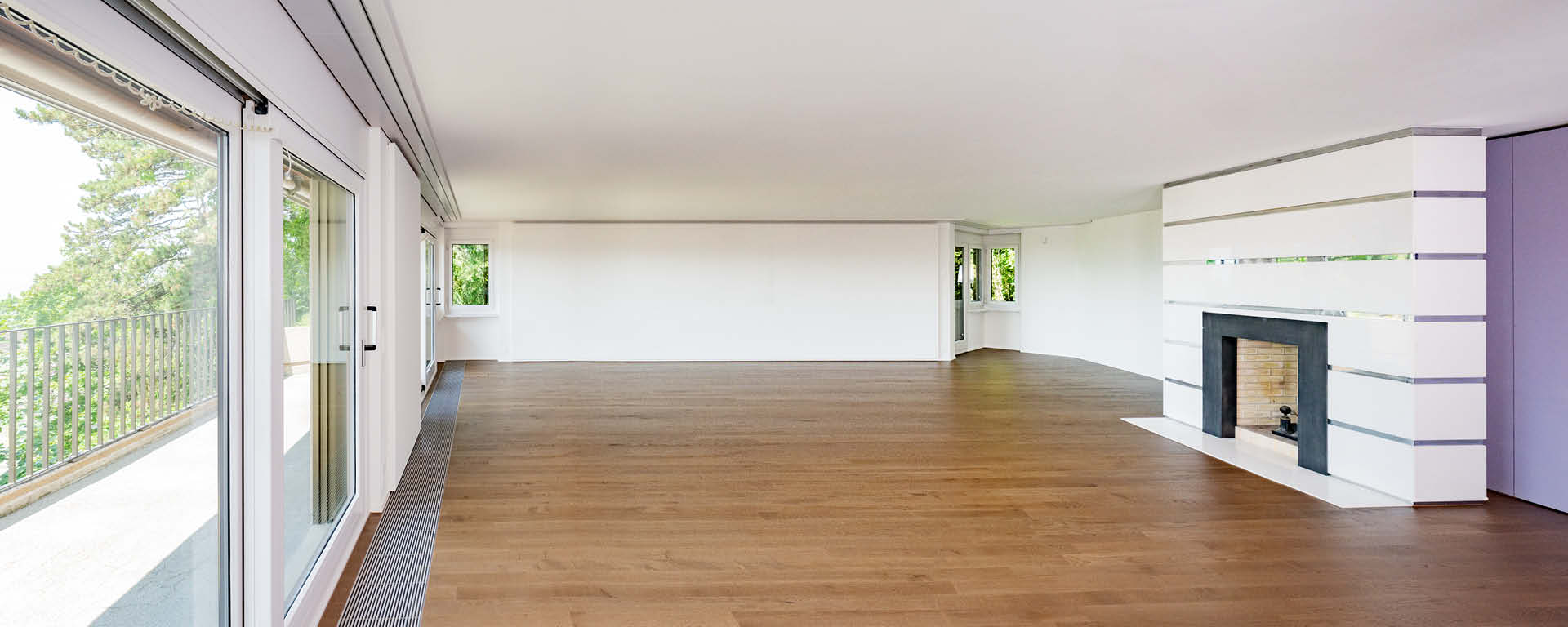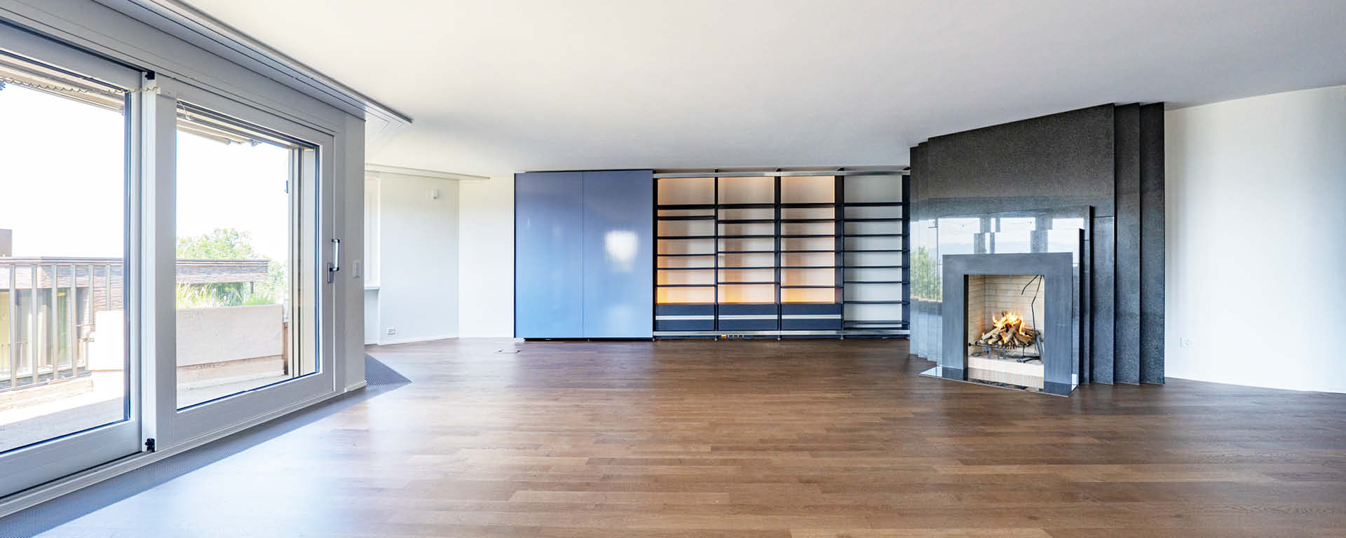 In der Wohnhalle im Südwesten des fliessenden Raumes ist viel Platz für individuelle Sitzarrangements, in denen man sich wunderbar am Cheminée entspannen kann. Im Zentrum der Wohnung kragt ein Erker nach Süden aus, wo man auch bei widrigem Wetter die spektakuläre Aussicht geniessen kann.
