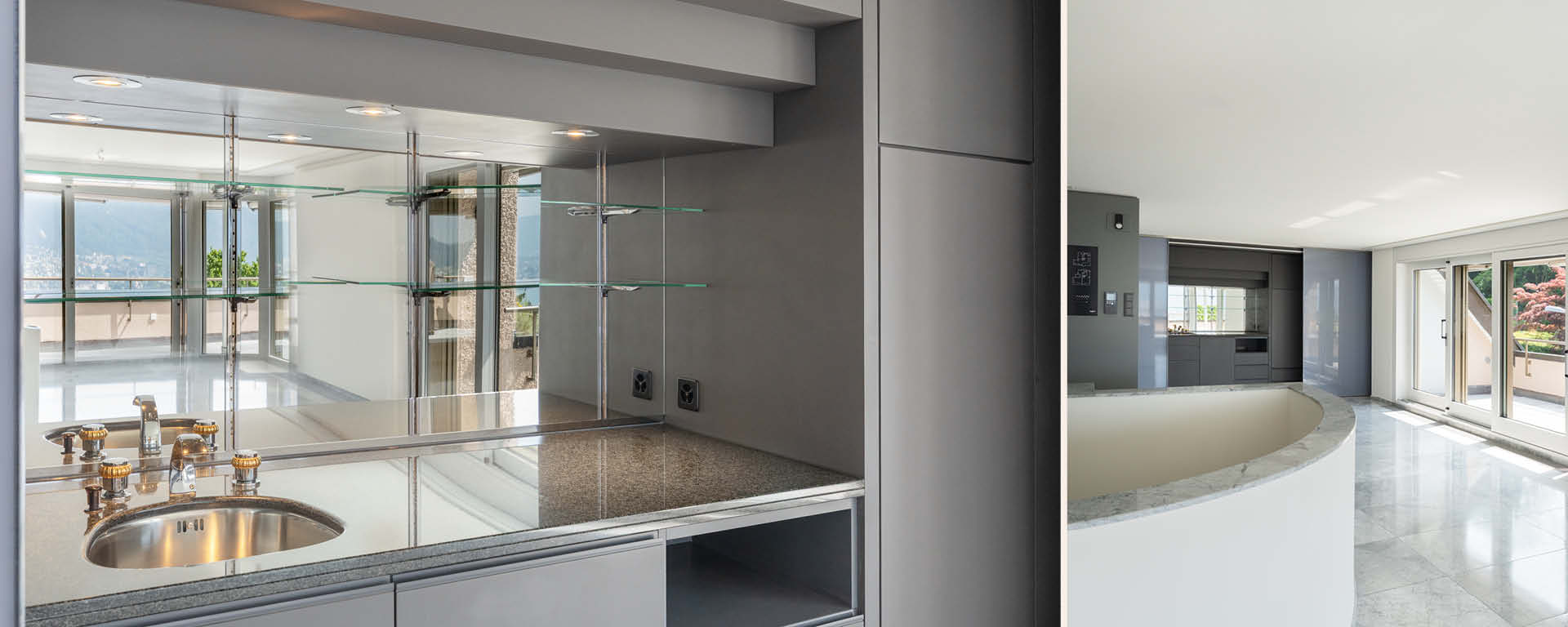 Im Osten schliesst der grosszügige Essbereich an, in dem man sich gerne zu einem köstlichen Festmahl versammelt. Im massgefertigten Sitzbereich der angrenzenden, hochwertig ausgestatteten Küche begrüsst man den neuen Tag bei einem herzhaften Z’morge. Das gesellige Zusammensein kann sich jederzeit auf der geräumigen Aussenterrasse fortsetzen. Dort steht die Plastik eines in die Aussicht versunkenen Menschen – eine aktualisierte, urbane Version des »Wanderers über dem Nebelmeer«.