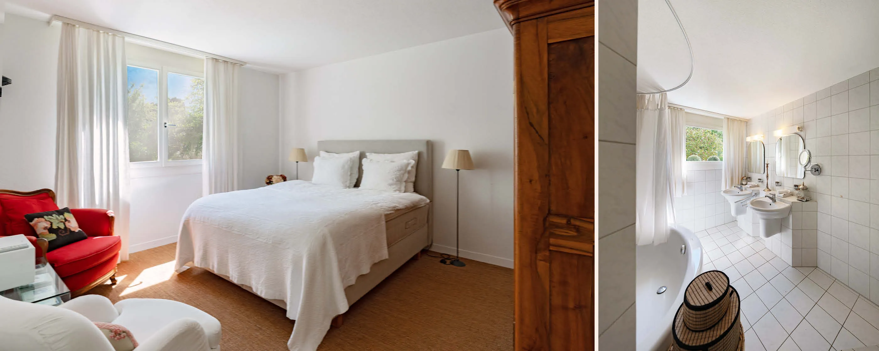 Das grosszügige Master-Schlafzimmer bietet viel Platz für himmlische Ruhestunden und hat ein grosses Bad zur Verfügung. Dem charmanten Kinder- oder Gästezimmer ist ein weiteres Bad mit Dusche zugeordnet. Und im grossen Garten, der sich wie eine Aussichtsterrasse weit nach Westen erstreckt, finden Gartenliebhaber zahlreiche Betätigungsfelder – je nach Leidenschaft von intensiv bis extensiv.
