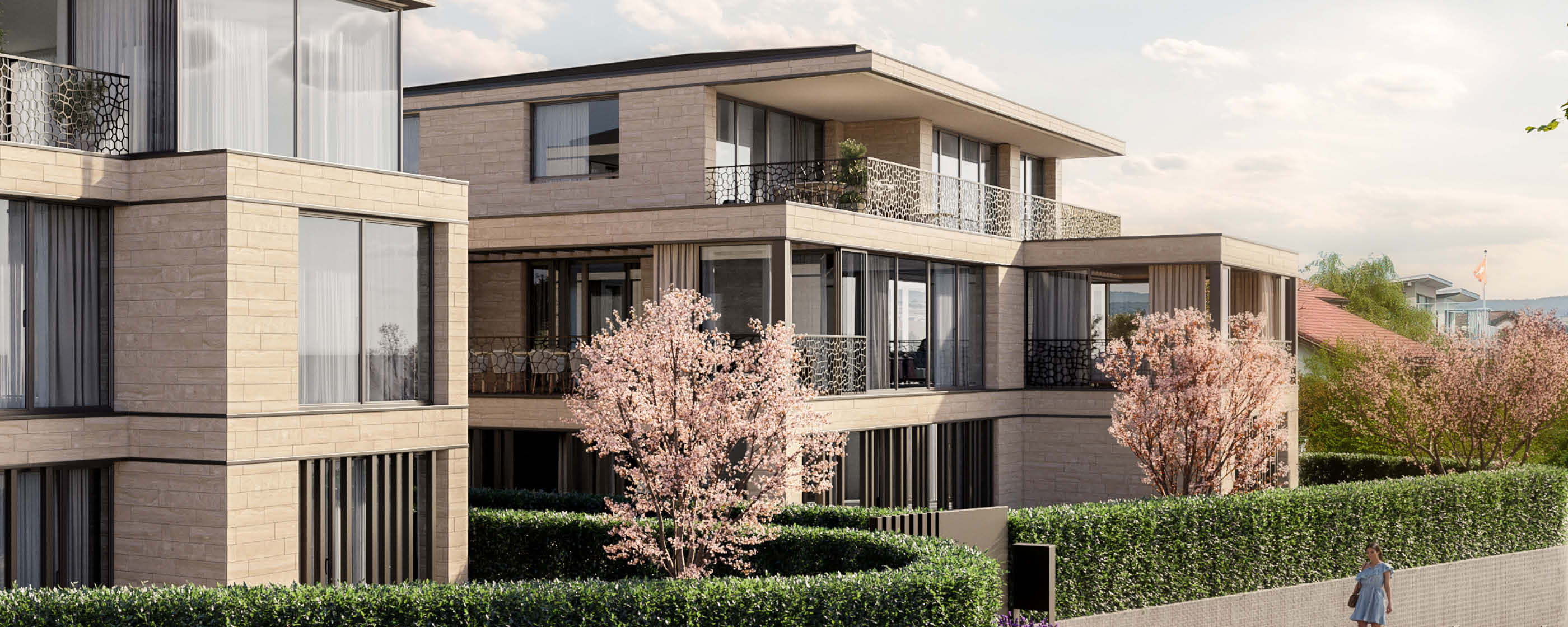 Die Architektur der Wohnung ist geprägt von einer klaren, modernen Formensprache, edlen Materialien und grosszügigen Glasflächen, die das Lichtspiel der Natur ins Innere holen. Die helle Fassade aus Naturstein und Glas fügt sich harmonisch in das bestehende Villenquartier ein. Metallische Akzente in den Balkongeländern erinnern an natürliche Strukturen und verstärken den Bezug zur umgebenden Landschaft.