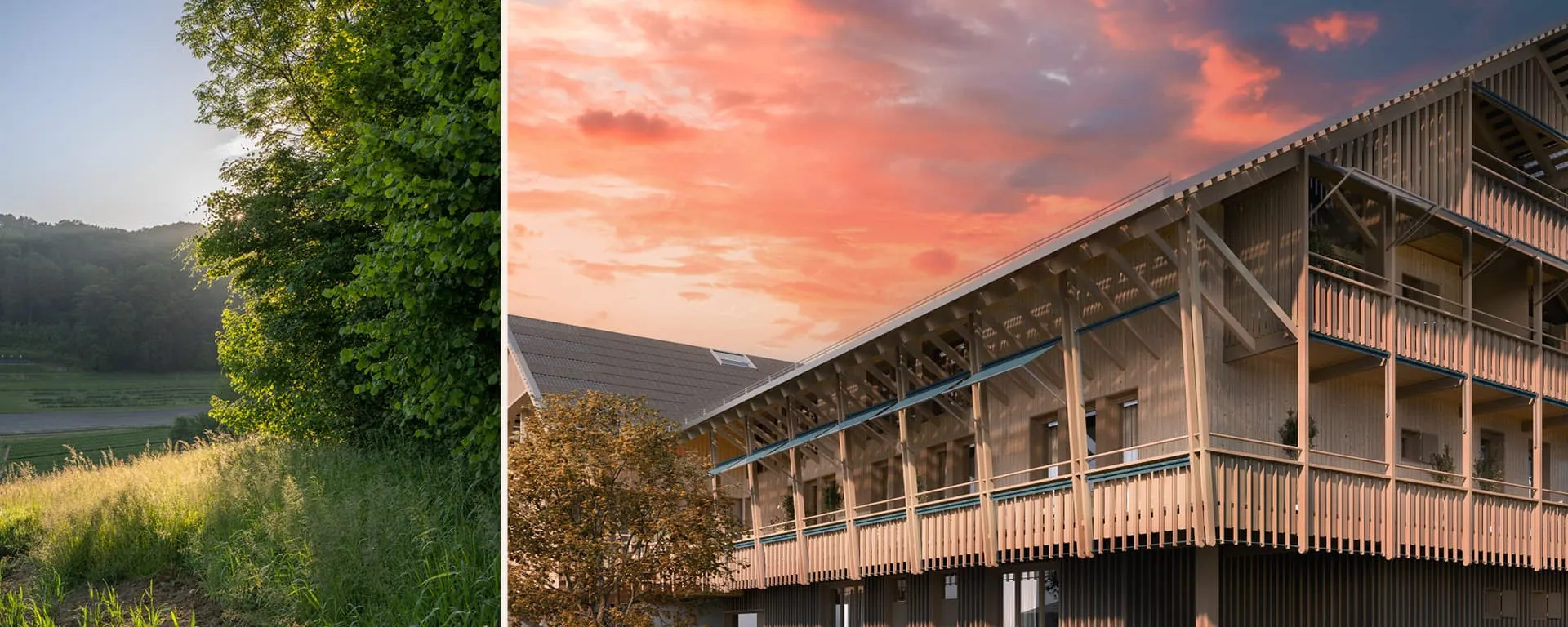 In der Region »Freiamt« fliesst die unbegradigte Reuss, der viertlängste Fluss der Schweiz, in zahlreichen malerischen Mäandern durch ein weites Tal. Am sanft hügeligen Rand des Reusstals liegt die noch ländlich geprägte Gemeinde Zufikon, in der das Mehrgenerationenhaus Laubehuus mit zahlreichen grosszügigen Wohnungen unterschiedlicher Grösse gebaut wird. Bei der Liegenschaft handelt es sich um ein soziales und ökologisches Modellprojekt, in dem Menschen unterschiedlicher Generationen unter einem Dach zusammenleben werden. Die Bewohnerinnen und Bewohner bilden eine engagierte Gemeinschaft, die gemeinsame Räume teilt und belebt, sich gegenseitig hilft und inspiriert. Gleichzeitig lebt man im Laubehuus inmitten einer abwechslungsreichen Naturlandschaft mit unzähligen Freizeitmöglichkeiten für Jung und Alt.