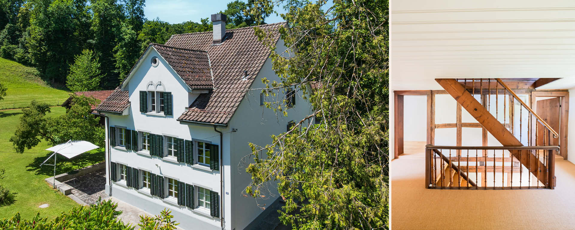 Die gepflegte, weiss getünchte Fassade mit der markanten Dachlukarne und den dunkelgrünen Fensterläden vermittelt auf den ersten Blick einen charmanten, bürgerlichen Charakter. Das Wohnhaus wurde mit viel Liebe zum Detail und hochwertigen Materialien renoviert und vereint historischen Charme mit modernem Wohnkomfort. Auf rund 280 m² Nettowohnfläche bieten helle, offene Räume mit Holzdecken, Parkett- und Dielenböden sowie eine grosszügige, moderne Küche den perfekten Rahmen für individuelles Wohnen und stilvolle Geselligkeit.
