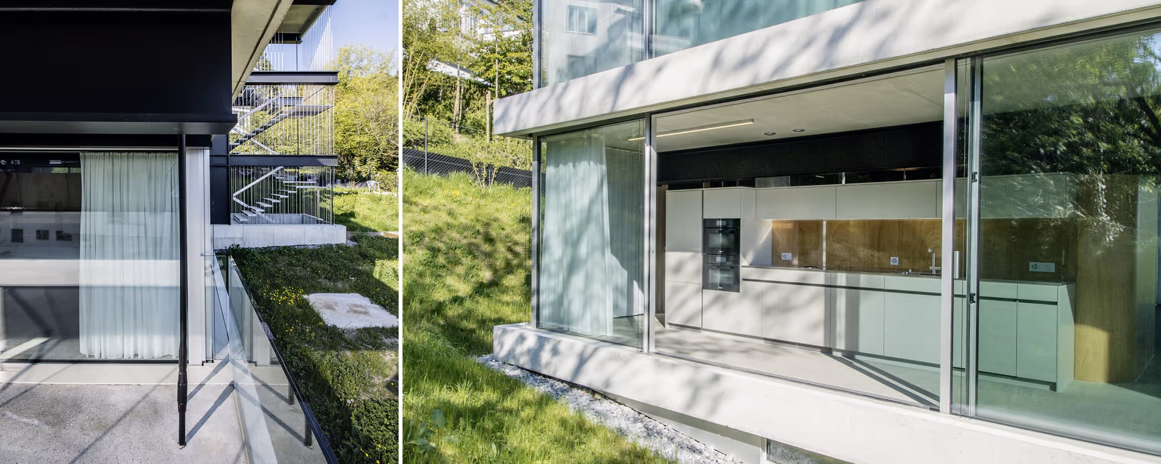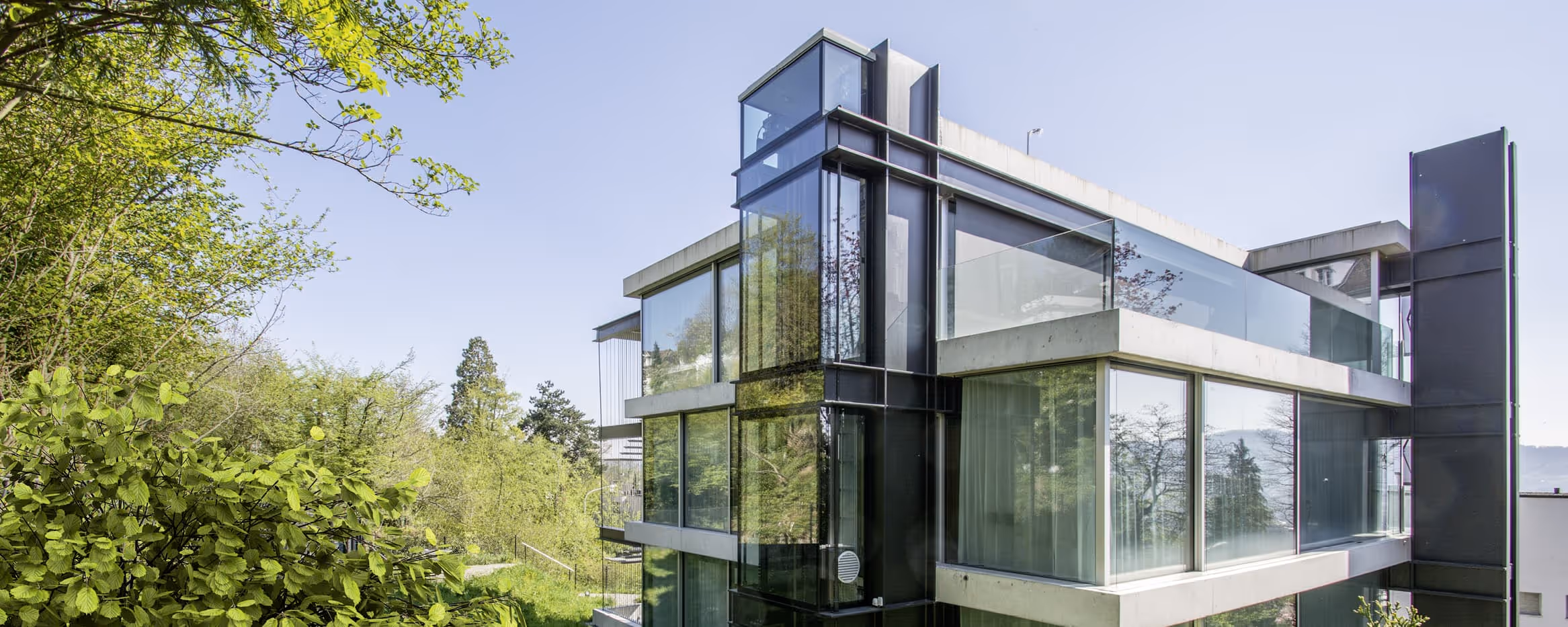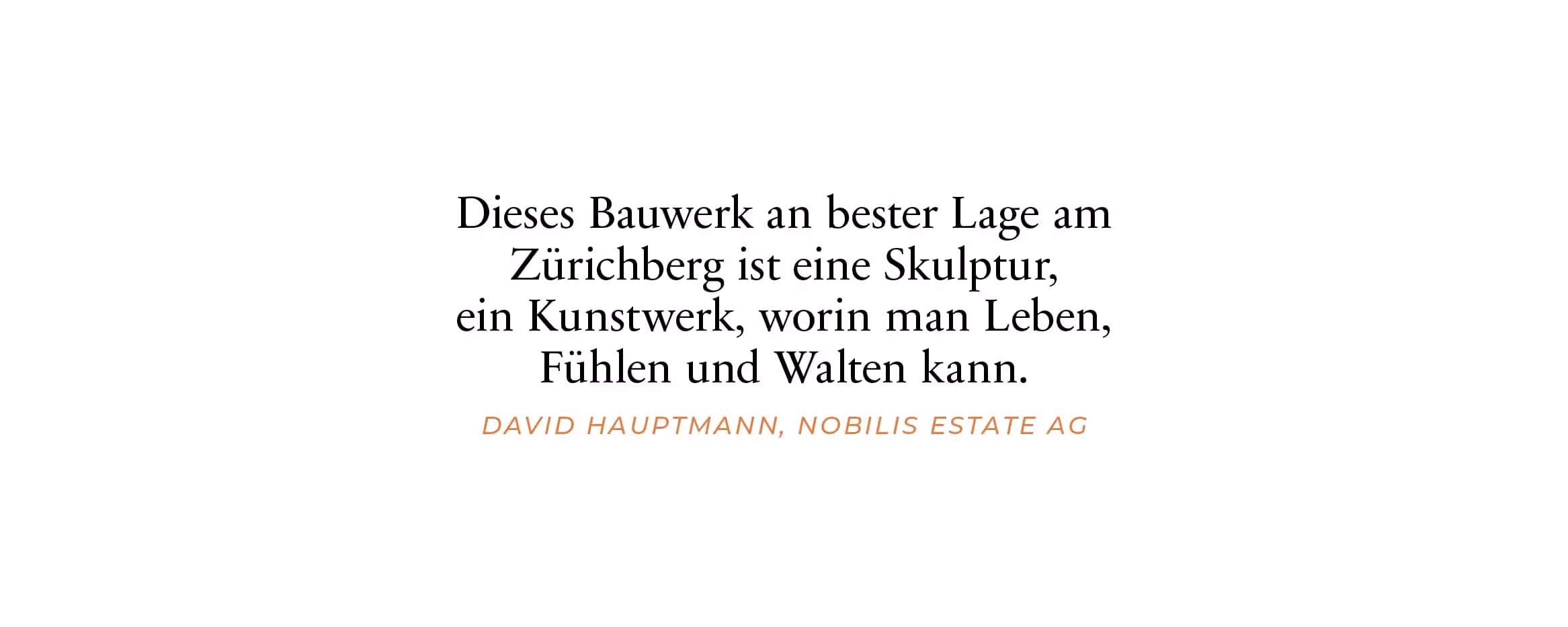 Das moderne Dreifamilienhaus liegt in einer diskreten Seitenstrasse von »8044 Zürichberg« auf einem ideal nach Südwesten ausgerichteten Grundstück. Bereits auf den ersten Blick sieht man, dass es sich um ein ganz besonderes Bauwerk handelt. Wie eine puristische »Sculpture of Modern Art« liegt das Haus wie selbstverständlich am Hang. Hier oben auf dem sonnigen Zürichberg lebt man in gebührenden Abstand von der Betriebsamkeit unten im Tal.