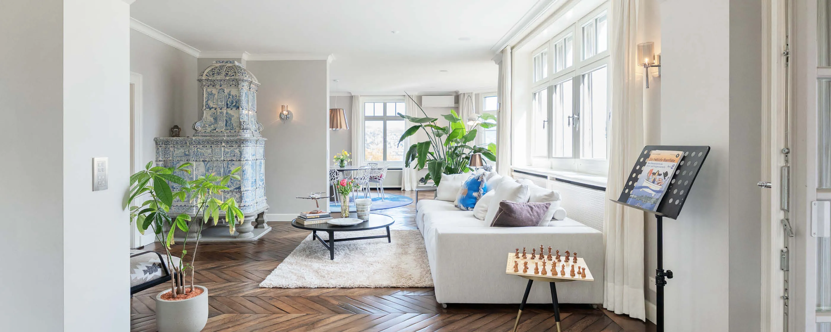 Der grosse Wohnsalon der historischen Villa strahlt mit feinem Eichenparkett und einem originalen Kachelofen jene Eleganz aus, wie man sie nur aus der Belle Epoque kennt. Im Westen schliesst eine gemütliche Lounge an, die auch als Bibliothek, Office oder Musikzimmer dienen kann.
